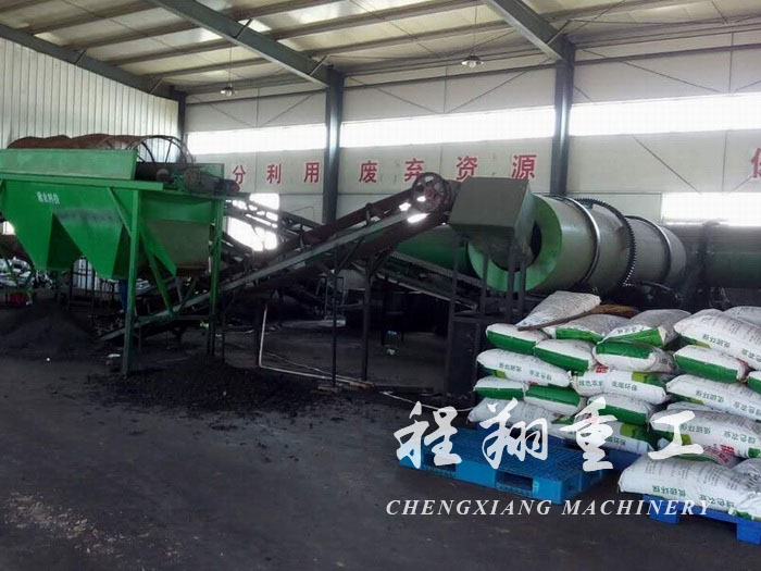 槽式翻堆機,加入生物菌種,發酵溫度控制在50-60℃,完成發酵后顏色呈深褐色,無糞臭但有堆肥氣味。